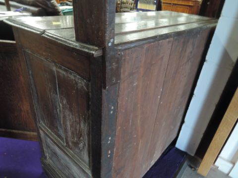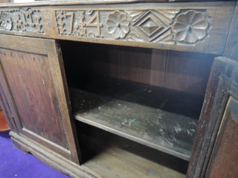 A Period oak dresser of small proportions having open delft rack , carved frieze bearing monogram AMI and 1714, possibly 18th Century and later