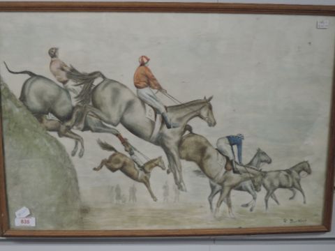 A watercolour, R Bartleet, steeple chase, signed 38 x 56cm, framed and glazed