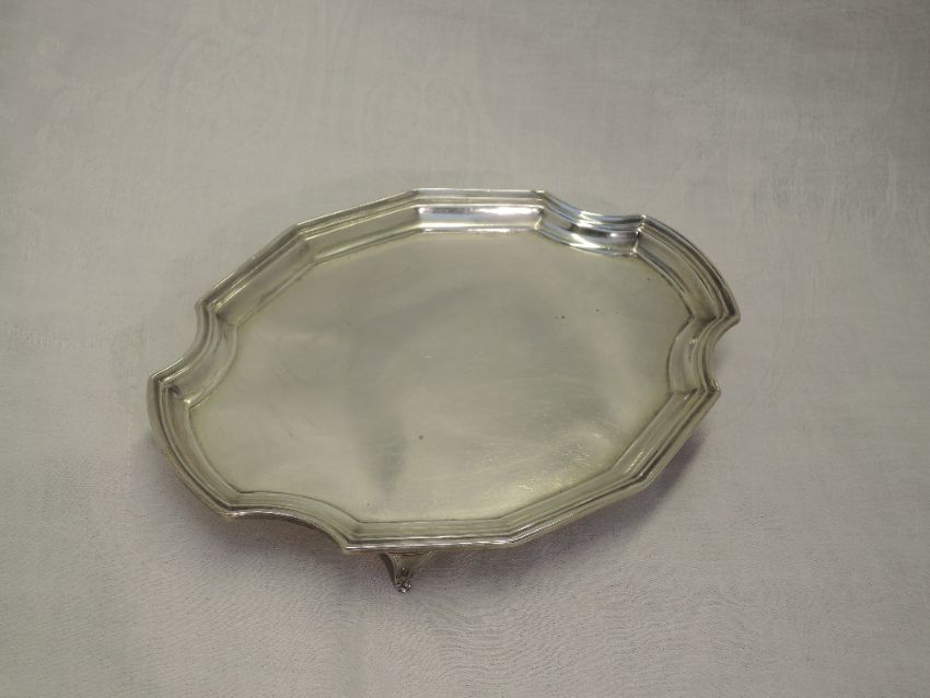 A small card tray of plain canted oval form having quatrefoil bracket feet and raised rim,London 1911, Ackroyd Rhodes, Manoah Rhodes & Sons Ltd, approx 183g