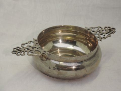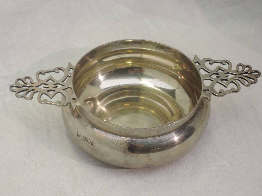 A Victorian silver porringer of plain circular form having decorative pierced handles and name engraved to rim, London 1899, makers mark worn, approx 242.5g