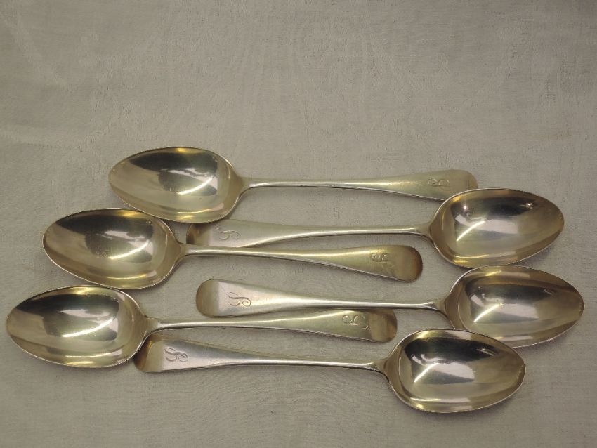 Six Edwardian silver dessert spoons of plain form bearing monogram G to terminals, Chester 1906, Walker & Hall, approx 301g