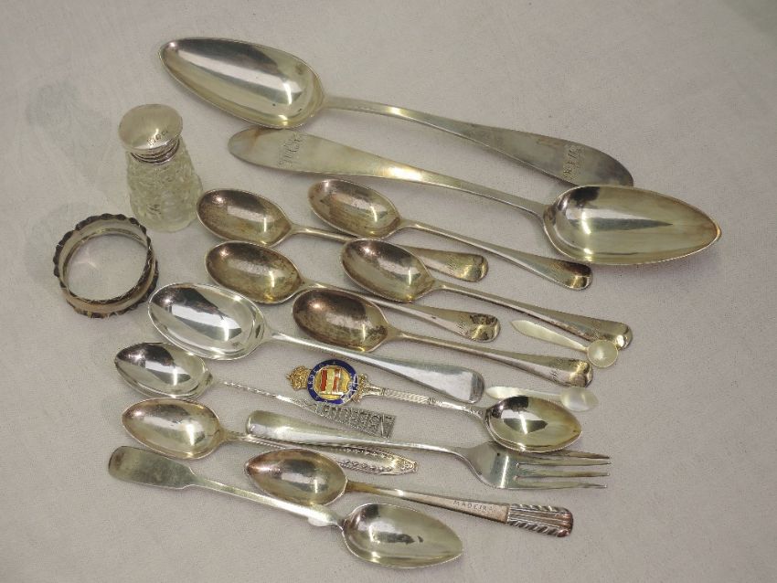 A selection of HM silver and white metal spoons including souvenir, teaspoons and table spoons, a cut glass bottle with glass stopper and HM silver lid, napkin ring etc