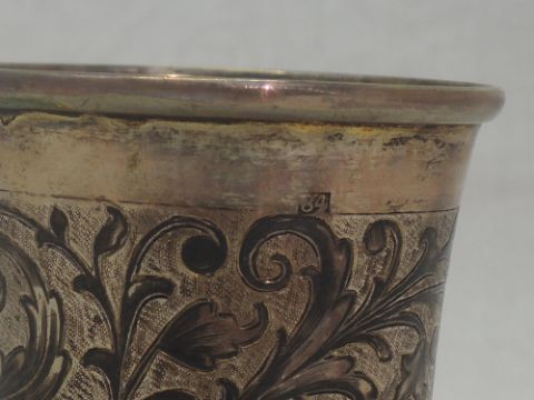 A Russian silver beaker having niello foliate scrolling decoration, flared rim and gilt interior, bearing Russian marks to base, possibly Moscow 1853, approx 62g