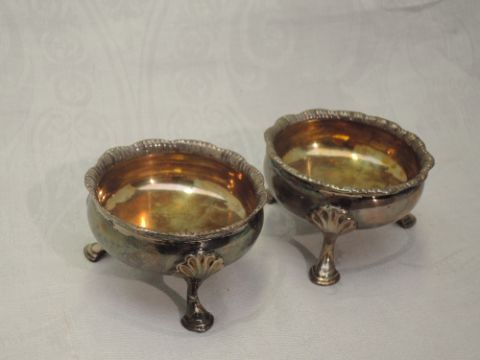 A matched pair of Georgian silver salts of circular form having trefoil hoof feet and frilled rims, hallmarks worn, one is London 1788, Hester Bateman, approx 139.4g