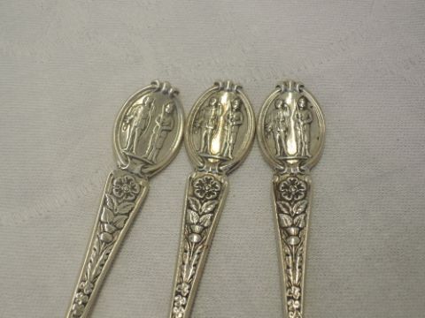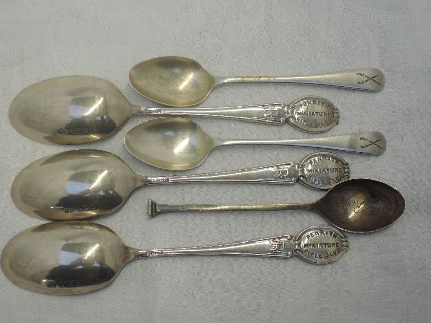 Three silver presentation spoons regarding Penrith miniature rifle club having moulded decoration to stems and terminals, Birminghan 1913/15, Elkington & Co, two HM silver teaspoons bearing crossed rifle decoration to terminals and an HM silver coffee spoon having an architectural style knop, approx 128.5g