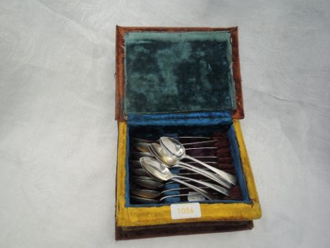 A velvet covered case in the form of a book containing fifteen Georgian silver teaspoons, including plain and bright cut decoration, dates including London 1813, Thomas Wallis & Jonathan Hayne x 5, London 1812, etc, approx 224g