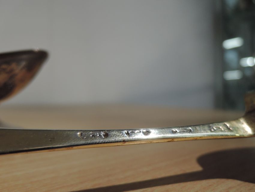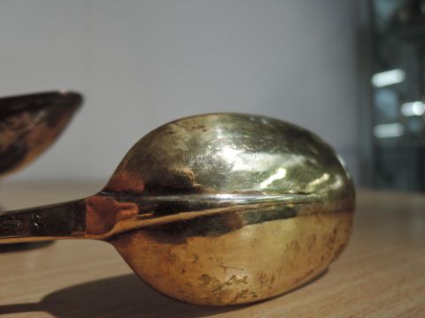 A pair of Georgian Scottish silver salts of plain navette form on pedestal feet, Edinburgh hallmarks but date and maker worn, possibly Francis Howden, and a pair of Georgian silver tablespoons of rat tail form, London hallmark, Andrew Archer, approx 170.9g