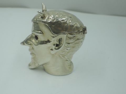 An HM silver novelty vesta modelled as a devil bearing horns to head, red glass eyes and press nose, maker mark: CME jewellery Ltd