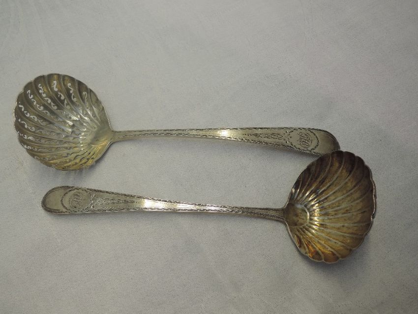 A pair of Irish Georgian silver sauce ladles having bright cut decoration to stems with monogrammed cartouche and scallop shell bowls, one being pierced as a caster spoon, Dublin, date mark worn, Michael Keating, approx 74.3g