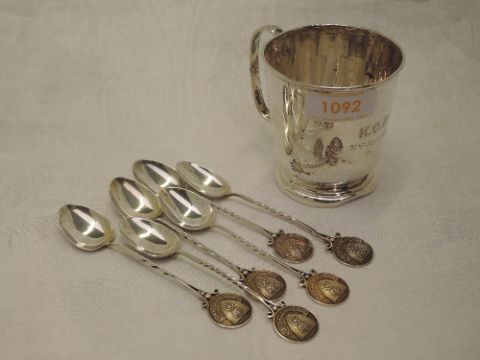 A small silver tankard of plain form having pedestal foot, rollover rim and monogrammed date to front, Sheffield 1931, P Ashberry & Sons, and a set of six HM silver teaspoons having terminals bearing Derbyshire Golf Club interest, approx 191g