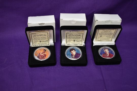 Three Morgan Mint Elvis Presley 2004 Silver Dollars in cases, each coloured on one side, each named, Jail House Rock, Blue Hawaii and Love Me Tender