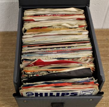 A carrying case of seven inch singles - a real random mix of styles and eras - case included - lots in relevant company bags