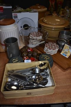 A mixed collection of kitchen ware including cutlery, herb sinner, veg spiraliser, napkin rings and more.