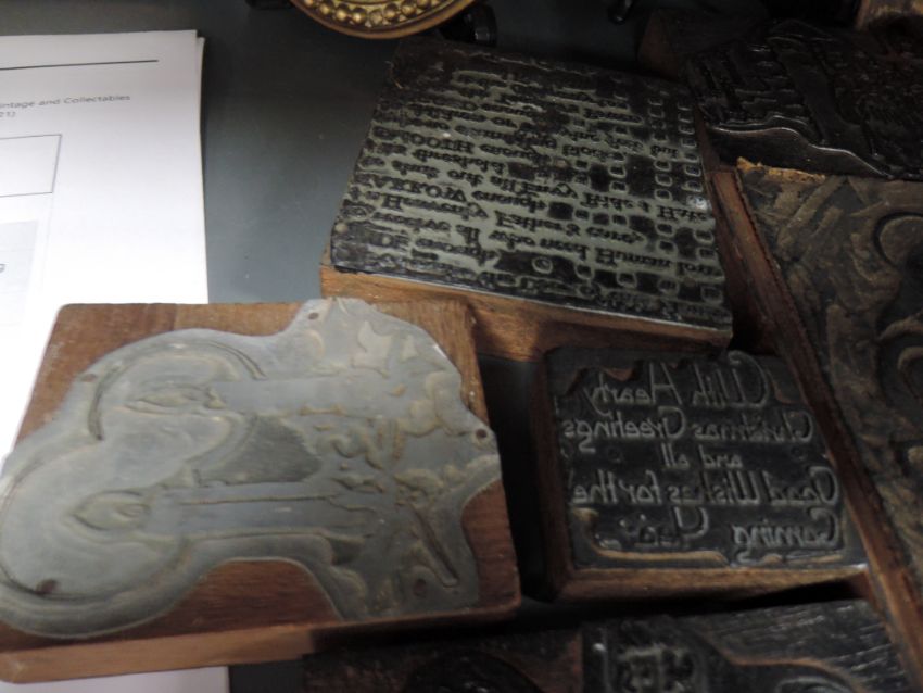 A selection of various stamps including lino and wood cut with Christmas themes and letter punch set