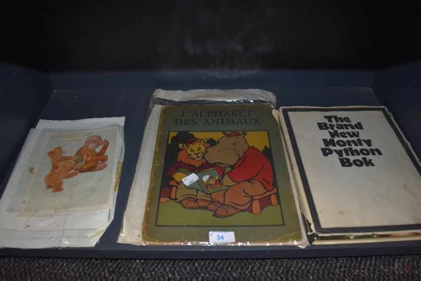A vintage Monty python book, a vintage French childrens book and two vintage Lawson Wood prints.