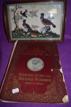 A copy of the illustrated London news silver jubilee record number 1910-1935 and an early 20th century oriental styled tray having golden pheasants and similar painted on papyrus,some small breaks in places.