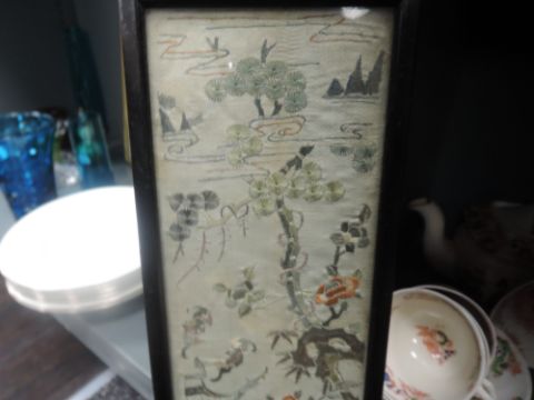 A pair of mirrored Chinese or Japanese silk screen panels hand sewn with needle work of Geisha in stylised fantasy landscape
