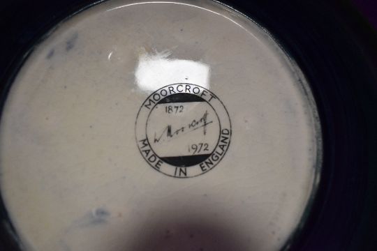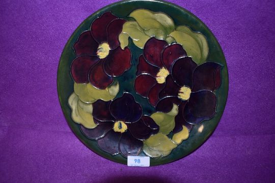 A Moorcroft plate having green ground with hibiscus like floral tube lined pattern,marked underside Moorcroft made in England 1872-1972.