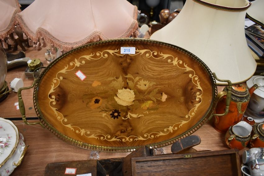 A vintage Italian inlaid gallery tray having brass handles and surround and floral design to centre.
