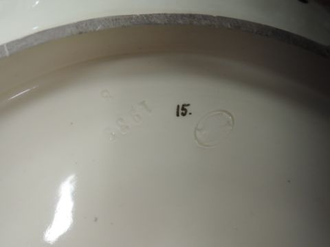 A large continental Majolica style charger having incised boarder with mythological scene having double fish stamp and 1939
