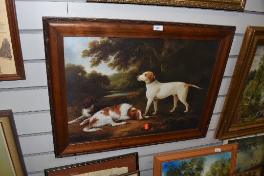 A framed full colour print of hunting hounds