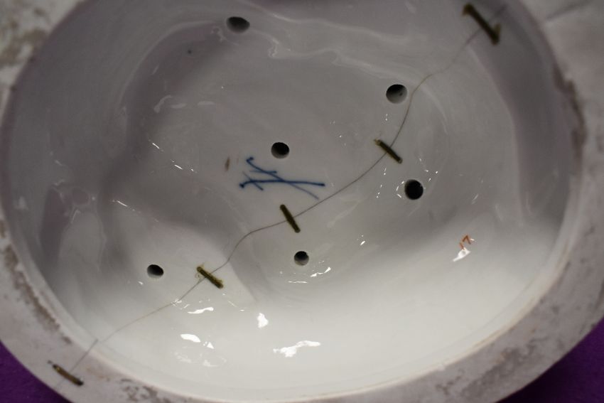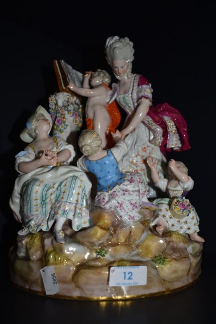 An impressive and substantial figure base depicting mythological and religious imagery of Cupid style Cherub and six maidens standing approx 31cm high having Meissen double cross swords to base and antique staple restoration to base AF