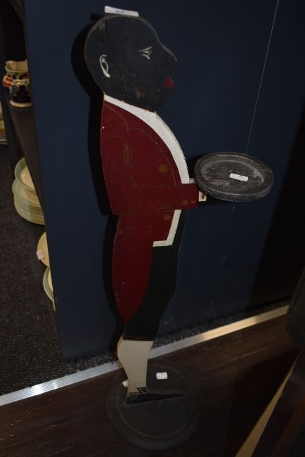 A vintage wooden floor standing butler card tray.