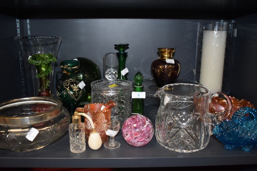 A selection of various glass wares including art and antique. Hand decorated Bohemian carnival and aqua blue pressed ect