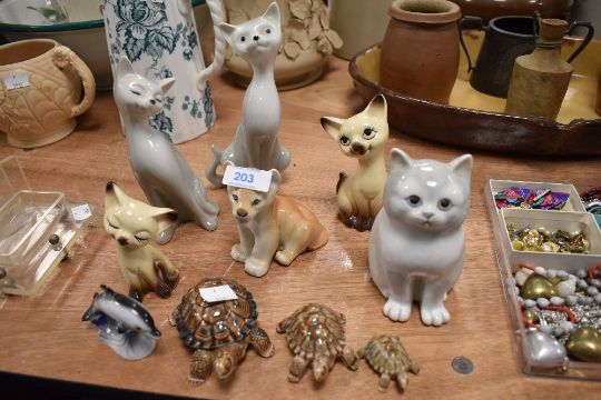 A collection of retro cats and three wade tortoises, one with removable shell lid.