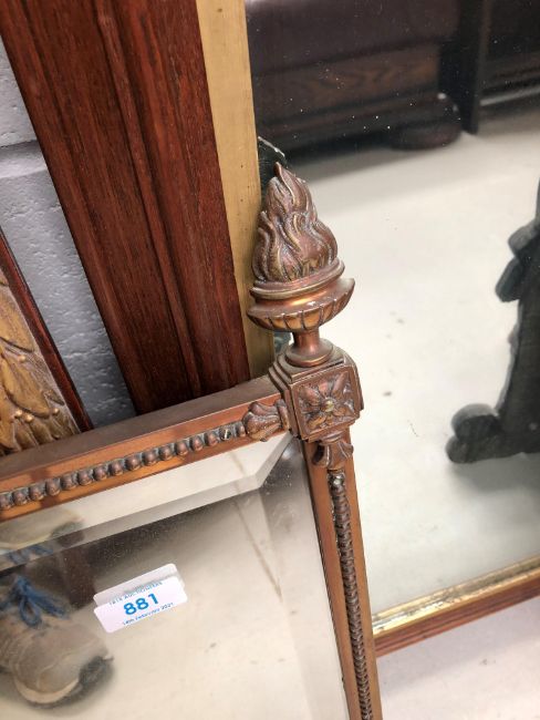 An antique coppered brass framed mantle mirror having torchere ends with studded frame, approx width 78cm