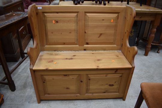 A modern natural pine box settle of small proportions, width approx. 91cm