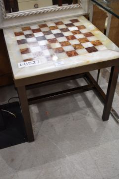 A heavy brass effect framed stone cut and inlayed chess or games board also ideal side table