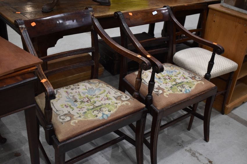 A pair of 19th Century carver style chairs having scrolled arms tree of life styled upholstery on turned frames, and a stained frame bedroom chair