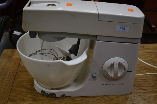 A Kenwood kitchen aid or chef with plastic bowl and accessories