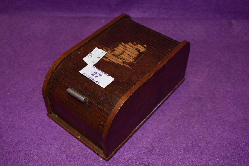 A vintage wooden roll top cigarette box with kinetic internal movement, having ship design to top.
