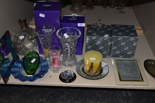 An assortment of glass and crystal items including photo frames, two Edinburgh crystal vases and more.
