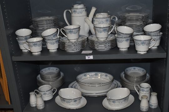 A large amount of Noritake blue hill dinner service including tea and coffee pots, serving dishes,bowls,plates,cruet and much more around ninety seven items.