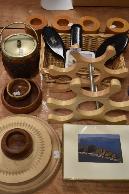 A vintage dressing table set and a selection of treen including vintage biscuit barrel, and more.