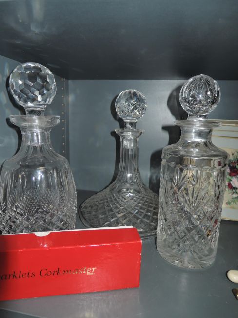 Two Waterford crystal decanters and similar Webb Corbett, also a selection of vintage place mats and cutlery.