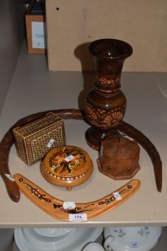 A selection of treen including boxes, vase and articulated snake.