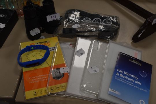 A selection of mobile phone accessories and similar,including screen protectors and cases, also included is a set of binoculars.