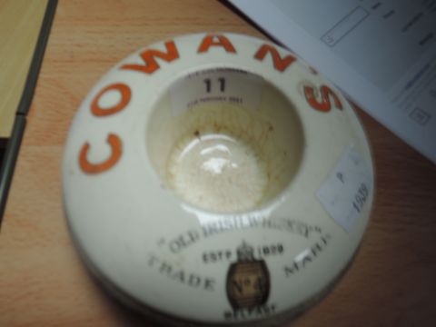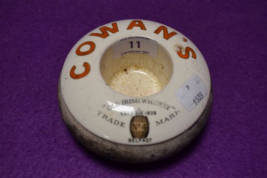 A Shelley advertising match striker for Cowan's Old Irish whiskey,bearing the Late Foley back stamp,around 1910 to 1916.