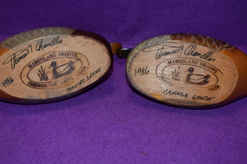 Two painted cedar decoy ducks by Thomas Chandler one Mallard Drake,the other a Canada Goose, both signed and marked Marshland decoys Sherwood park Alberta Canada both dated 1986.