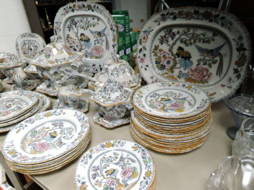 An impressive late Victorian Ashworth Bros Hanley ironstone partial dinner service,having Chinoiserie style pattern with birds and flowers incorporated throughout, around seventy nine items including large platters, drainer, plates, tureens and more.