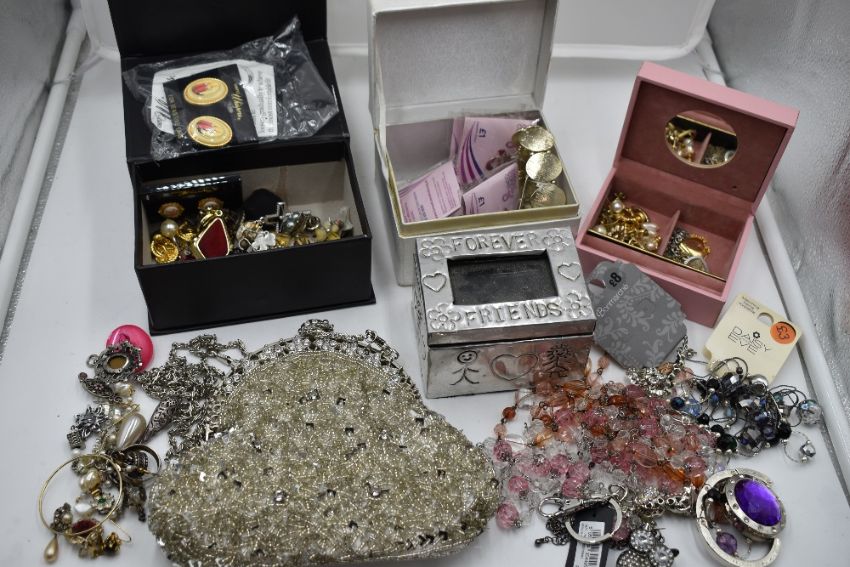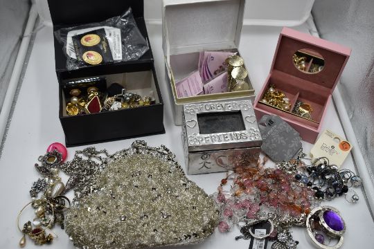 A selection of costume jewellery including earrings, pins, evening bag etc