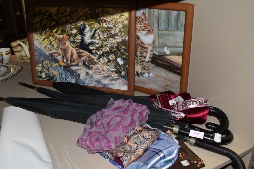 Two cat tea trays, a variety of vintage headscarves and umbrellas.