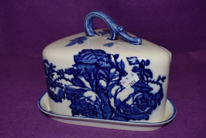 A ceramic cheese dome by Blakeney with blue and white transfer design base and cover both good condition
