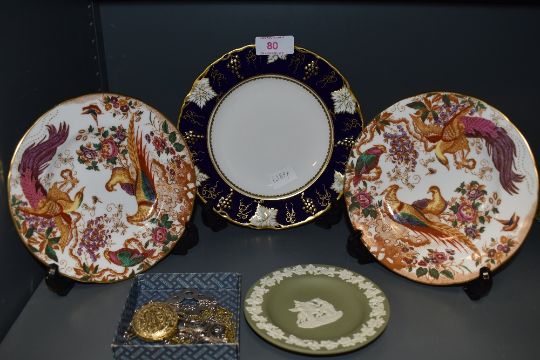 three Royal Crown Derby side plates, two Olde Avesbury and one Vine cobalt,also included is a Wedgwood pin dish and a selection of costume jewellery.