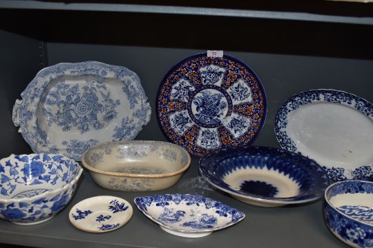 A selection of blue and white wear ceramics including Spode Copelands green stamped dish