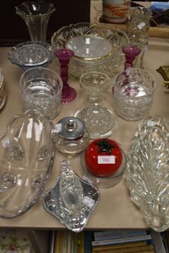 An assortment of vintage glass ware including dishes, fruit bowl,vases and more.